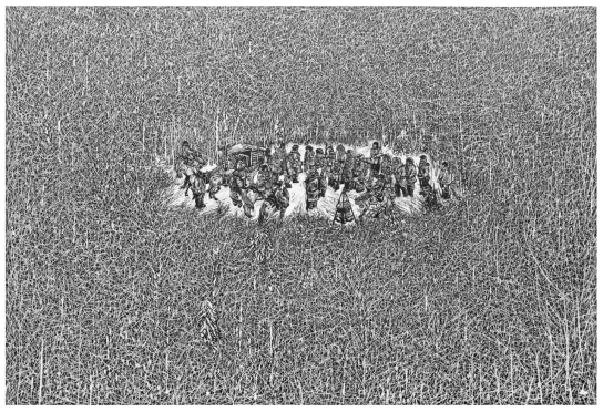 《抗联往事之会师那尔轰》作为闫垒垒东北抗联主题性木刻版画系列创作之一,描绘了 1935 年 9 月东北人民革命军第一军与第二军的会师场景。区别于多数抗联美术作品侧重典型人物与战斗场景,本次创作以创新画面语言、强化中心视角的记述方式传递抗联精神。作品四周以密集抽象线条表现冬日长白密林的遮天蔽日,既展现抗联战士的恶劣生存环境,亦隐喻日伪大举围剿的艰苦条件,营造出强烈压迫感与紧张感。画面中心会师场景清晰,地上车辙、脚印及人马朝向,将视觉引向杨靖宇与李学忠即将握手的瞬间;指战员、少年战士、雪覆密营 “地戗子”、行军锅架等元素的艺术还原,让抗联队伍形象更饱满立体。作品核心特征为中心场景与密林的强烈疏密对比,这种视觉冲突更好地暗喻主旨:抗联队伍虽处险境,却以不屈抗争精神抵御日寇,以血肉之躯撕开黑暗、筑就民族长城。